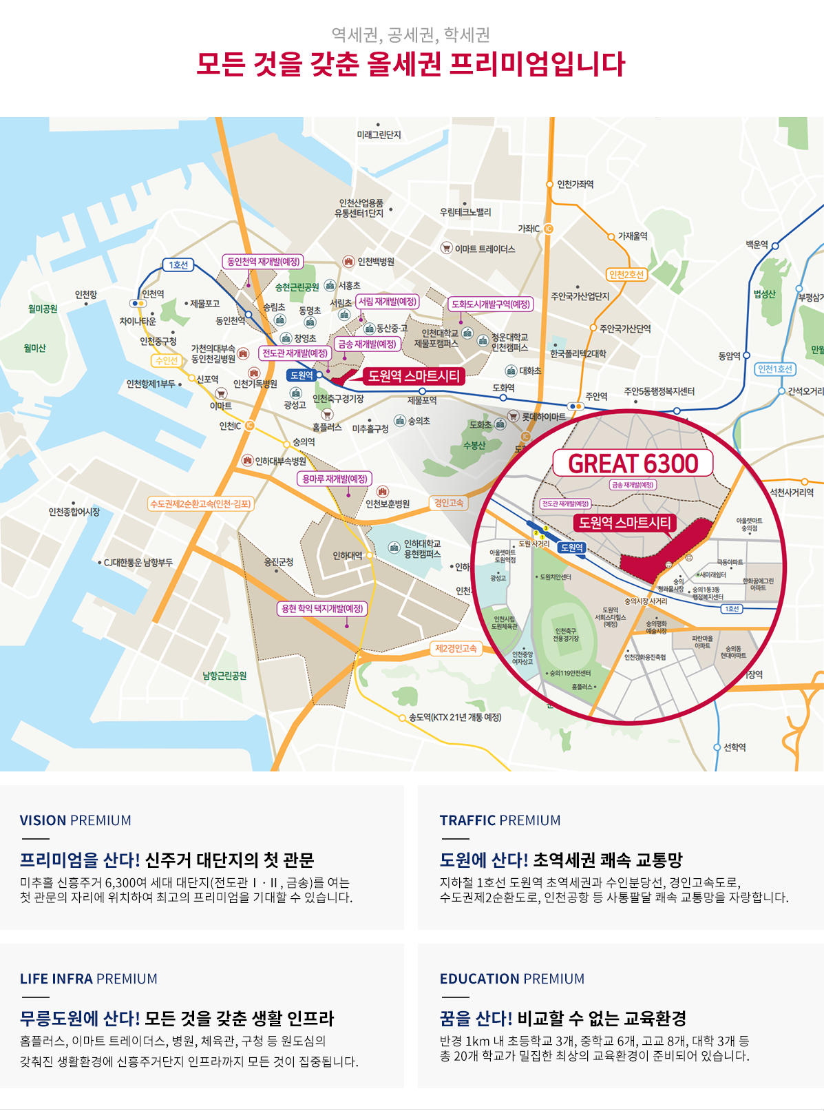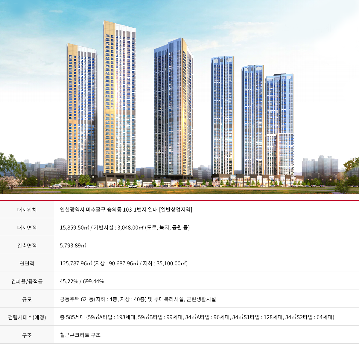 경인선 1호선 도원역 초역세권 서울 및 인천 도심을 빠르게 연결하는 최적의 교통 입지 1호선 도원역을 도보로 바로 이용할 수 있는 초역세권에 위치하여 편리한 출퇴근과 대중교통 이용의 프리미엄을 누립니다. 총 1,291세대 대규모 주거타운 인천 구도심을 대표하는 새로운 브랜드 단지 완성 1,291세대의 압도적인 규모로 조성되어 대단지가 주는 안정적인 관리비와 풍부한 단지 내 인프라를 제공합니다. 최고 49층의 랜드마크 스카이라인 인천 도심의 경관을 압도하는 웅장한 높이 지상 최고 49층 높이로 설계되어 일부 세대에서 우수한 조망권을 확보하고 지역을 대표하는 상징성을 갖춥니다. 숭의/용현 도시재생 뉴딜사업의 수혜 주변 지역 개발 호재와 함께 가치가 동반 상승 인천시의 대규모 도시 재생 사업이 인접하여 지속적인 주거 환경 개선과 미래 가치 상승을 기대할 수 있습니다. 단지 인근 도원역 일대 상권 이용 편리 홈플러스, 인천축구전용경기장 등 풍부한 생활 인프라 도원역 주변의 활성화된 상권과 홈플러스, 인천축구전용경기장 등 쇼핑, 문화, 여가 시설을 편리하게 이용할 수 있습니다. 전 세대 남향 위주 배치의 쾌적한 환경 채광 및 통풍을 극대화한 단지 설계 미학 전 세대를 남향 위주로 배치하여 풍부한 일조량과 뛰어난 통풍 효과를 확보함으로써 주거 쾌적성을 높였습니다. 다양한 커뮤니티 시설과 입주민 편의 피트니스, 작은 도서관 등 삶의 질을 높이는 시설 단지 내에 조성되는 다양한 커뮤니티 시설을 통해 입주민들이 건강과 여가를 편리하게 즐길 수 있는 환경을 제공합니다.